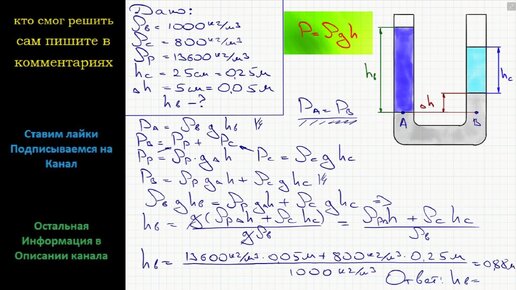 Физика В вертикальные сообщающиеся сосуды поверх ртути (3) налиты различные жидкости. В один сосуд столбик воды (1), а в другой столбик
