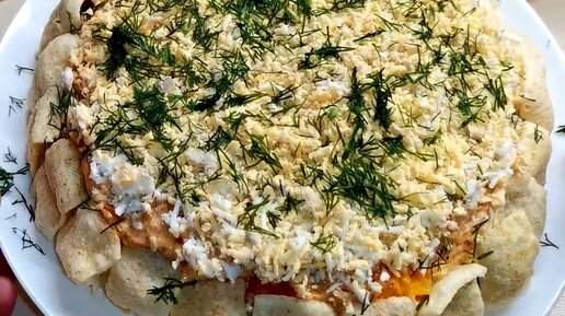 Легкий салат на праздничный стол из куриной печени и наших любимых овощей с огненной добавкой для пикантности, украшенный заморскими чипсами