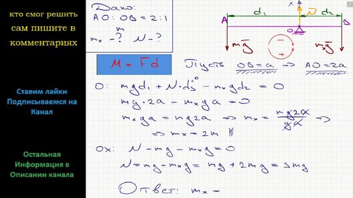 Физика Невесомый стержень AB может свободно вращаться вокруг опоры точки O такой, что AO:OB = 2:1. В точке A к стержню подвешивают груз