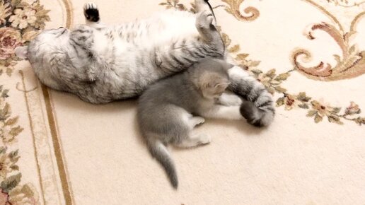 Малышка и папин хвост. Котёнок кошки Кайли играет с хвостом своего отца кота Маню. Котёнок сильно мурлычет во время игры.