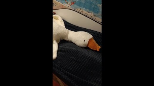 Дочка снимает распоковку мягкой игрушки Гусь-обнимусь