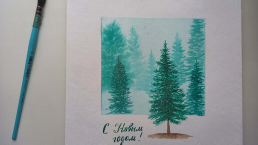 Новогодняя открытка "Зимний лес". Акварель.