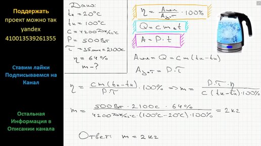 Физика Чему равна масса воды которую нагревают от 20 до 100 °С с помощью электронагревателя мощностью 500 Вт в течение 35 мин если известно