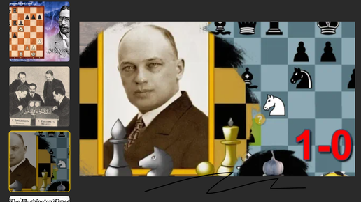 И снова победа на 14 ходу в волшебном гамбите Эванса: Савелий Тартаковер "закаспаривает" коня на е5 и забирает победу (Австрия, 1914, 1-0)