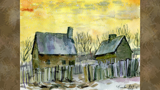 Старые домики на закате дня, акварель