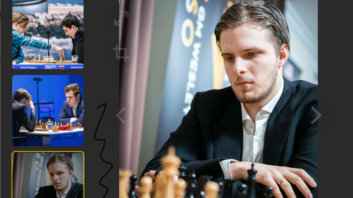Рихард Раппорт получает неожиданную для него жертву ферзя от Пеллетье, игравшего черными и медленно, красиво проигрывает в Баку, 2016, 0-1