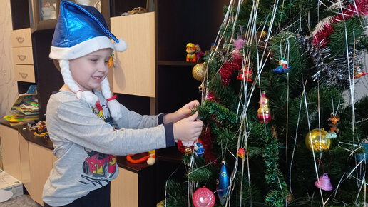 Макс украшает новогоднюю ёлку игрушками.