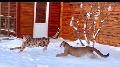 Новый уровень отношений пумы Месси и гепарда Герды - гонки котов по снегу