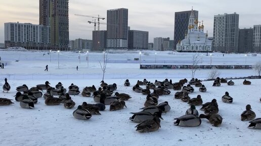 Екатеринбург 31.12.2022 погода -20, ночью до -26. Замерзающие утки в Академическом районе.