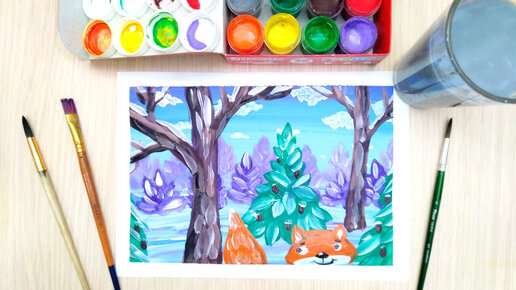 Показываю, как нарисовать лисёнка в зимнем лесу гуашью