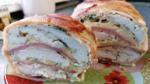 КУРИНЫЙ РУЛЕТ В БЕКОНЕ С НАЧИНКОЙ ИЗ ВЕТЧИНЫ И СЫРА.Всегда готовила и буду, очень просто и очень вкусно!
