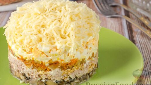 Нежный и насыщенный. Слоёный салат с тунцом и грибами.