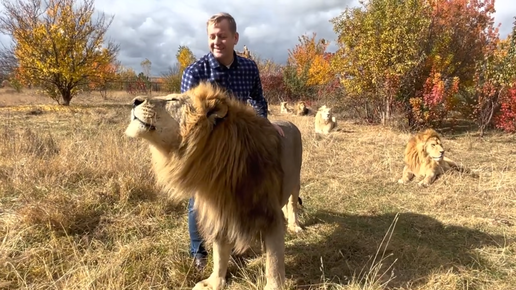Вожак львов и его прайд встречают хозяина парка после трех месяцев разлуки.