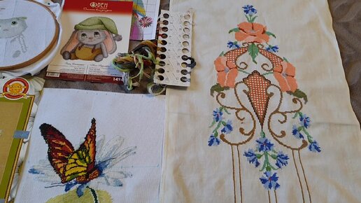 Обзор моих процессов: бабочка и зайка-степашка, вышитая салфетка
