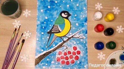 Как нарисовать синицу. Рисуем птицу гуашью. Зимний рисунок пошагово
