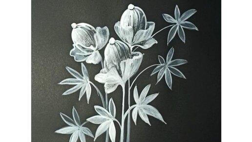 Три белых цветка, нарисованные белой гуашью на чёрной бумаге.