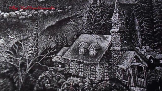 Гравировка бормашиной картины на стекле "Предновогодняя ночь".