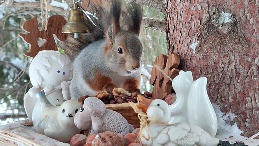 Две белки по очереди грызут кедряшки в новой кормушке