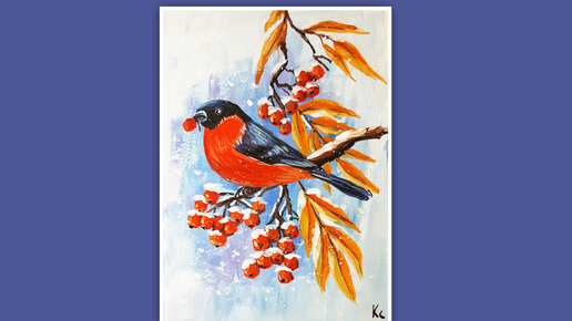 Снегирь гуашью-очень просто! Яркий зимний рисунок в подарок! Как просто нарисовать снегиря! Снегирь на рябине. Снегирь гуашью просто