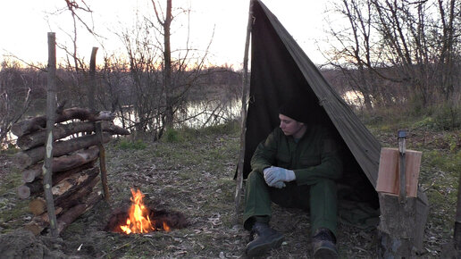 Кемпинг Лагерь на берегу реки, Укрытие из плащ палатки, костёр разведчика в земле.