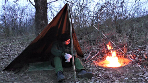 Кемпинг на берегу реки, Простое Укрытие из плащ палатки, Приготовил еду на костре