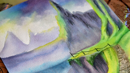 Как нарисовать горы, небо, облака. Пейзаж акварелью.