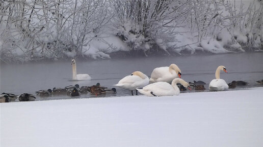 Морозное рождественское утро! Гатчинские лебеди мирно отдыхают после завтрака! Только Гоша купается и танцует!