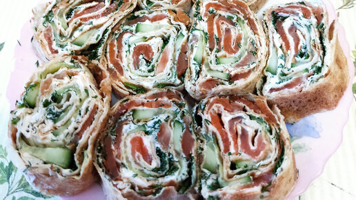 Рулет из тонкого лаваша с красной рыбой, творожным сыром и свежим ароматным огурцом.