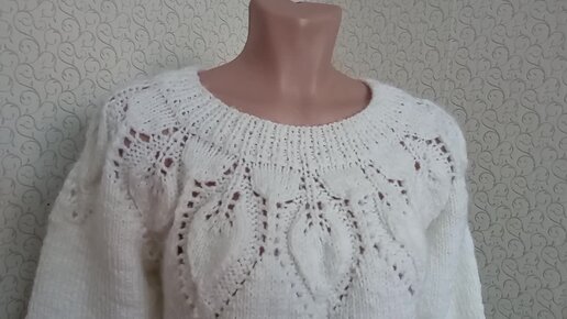 джемпер круглой кокеткой узором листья спицами