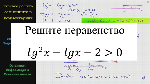 Математика Решите неравенство (lgx)^2 - lgx - 2 > 0