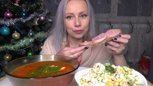 Борщ домашний, салат из крабовых палочек. Мукбанг. Еда.