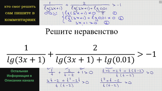 Математика Решите неравенство 1/(lg(3x+1)) + 2/(lg(3x+1)+lg(0.01)) > -1