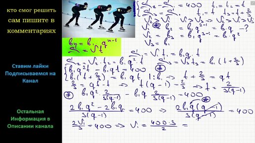 Математика Три конькобежца, скорости которых в некотором порядке образуют геометрическую прогрессию одновременно стартуют (из одного места)