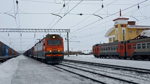 Электровоз 2ЭС6-503 с грузовым составом; станция Каргат