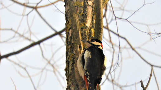 Вечерний январский дятел. Игра на "тамтаме". Сухой сучок с отверстием. Поразительно.