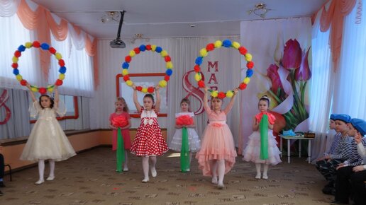 Танец девочек на 8 марта с красивыми атрибутами: всем известными обручами и необычными цветами из шёлка, которые смастерила наша кастелянша.