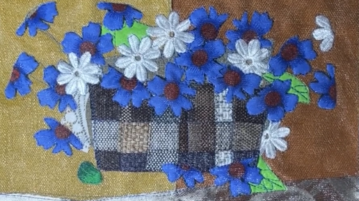ИЗ ЛОСКУТОВ КОРЗИНА С БЕЛЫМИ И ГОЛУБЫМИ ЦВЕТАМИ_ ТЕКСТИЛЬНАЯ ПИЦЦА