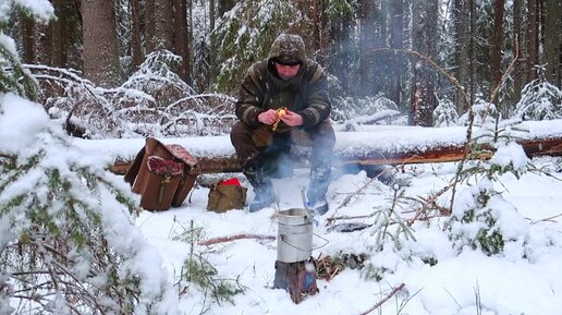 Поход в лес зимой,готовка на печке в морозном лесу.