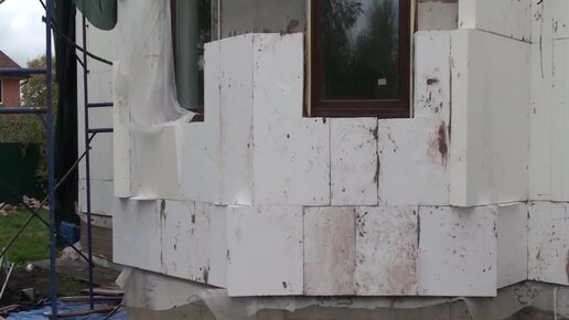 Рабочие заказчика учатся клеить пенополистирол на фасады дома, пропущена перевязка листов на наружном углу эркера, нарушена разбежка листов