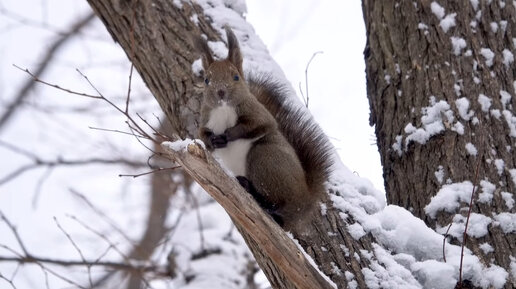 Очень миленькая белка играет в снегу, ест орехи и прыгает по деревьям