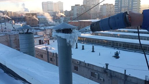 Отогреваем канализационную вытяжку. В трубе намёрз снег.