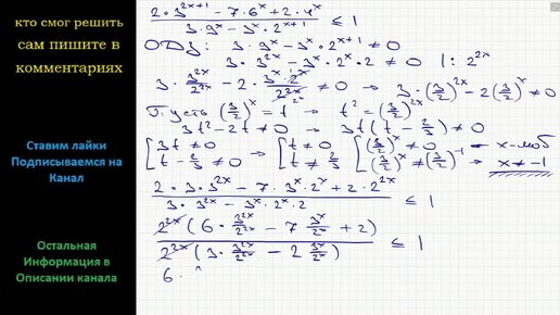 Математика Решите неравенство (2∙3^(2x+1) - 7∙6^x+2∙4^x)/(3∙9^x - 3∙2^(x+1)) ≤ 1