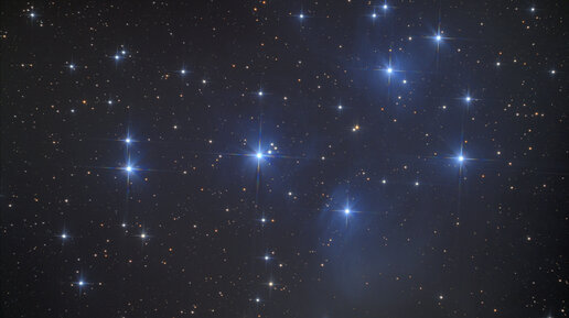 Звёздное скопление Плеяды на ночном небе и через телескоп.