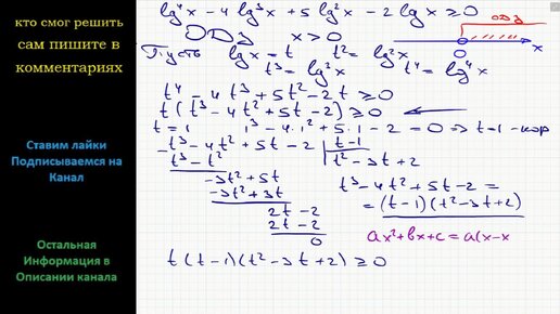 Математика Решите неравенство: (lg x)^4 - 4(lg x)^3 + 5(lg x)^2 - 2lg x ≥0