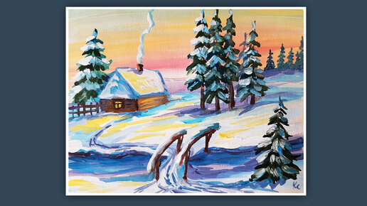 Рисуем зимний пейзаж. Как нарисовать зимний пейзаж с домиком и речкой. Простой рисунок для детей.Зимний пейзаж гуашью просто.Уроки рисования
