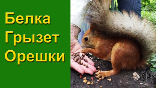 Дикая белка. Гладим ее. Она берет и грызет орешки с ладони.