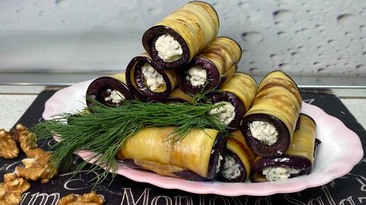 Рулетики из баклажанов с нежным сыром Фета и кусочком грецкого ореха.