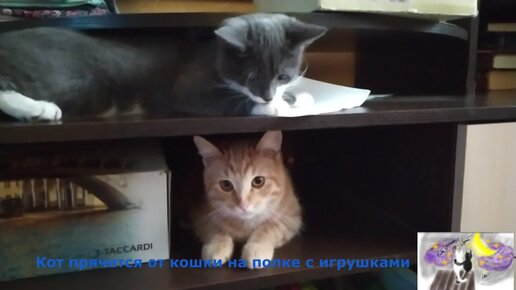 Постоянно дерутся Симба и Муська. Кот прячется от Кошки на полке с игрушками, а она играет с ним, словно с мышкой