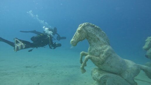 подводный музей, Каш, Турция. реплики украденных ликийских скульптур - Посейдон и его кони. Осваиваем подводный скутер