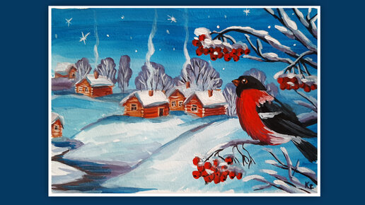Рисуем снегиря. Зимний пейзаж рисунок. Деревня зимой гуашью. Рисуем зиму Легкие рисунки. Как нарисовать снегиря и рябину.